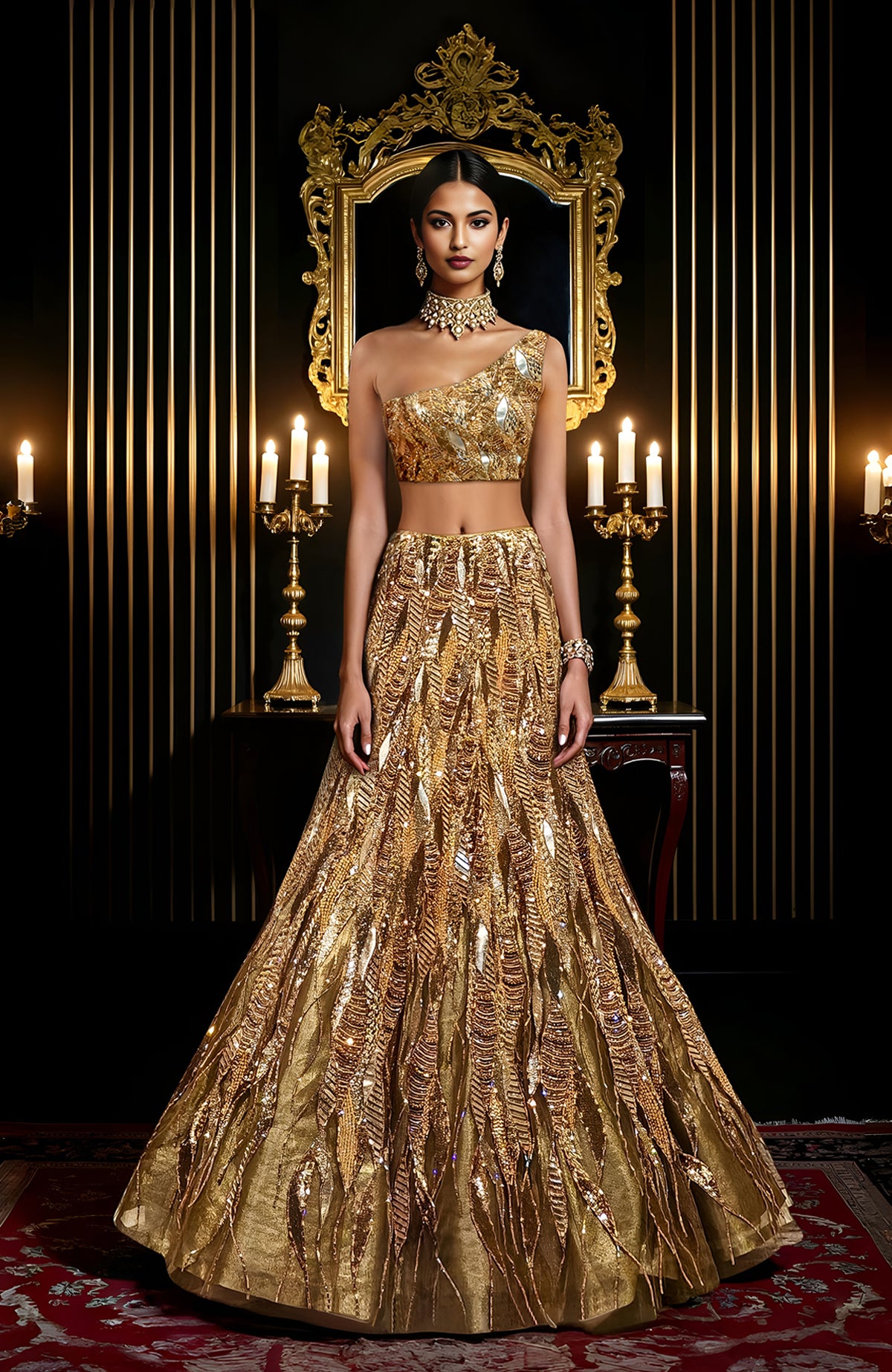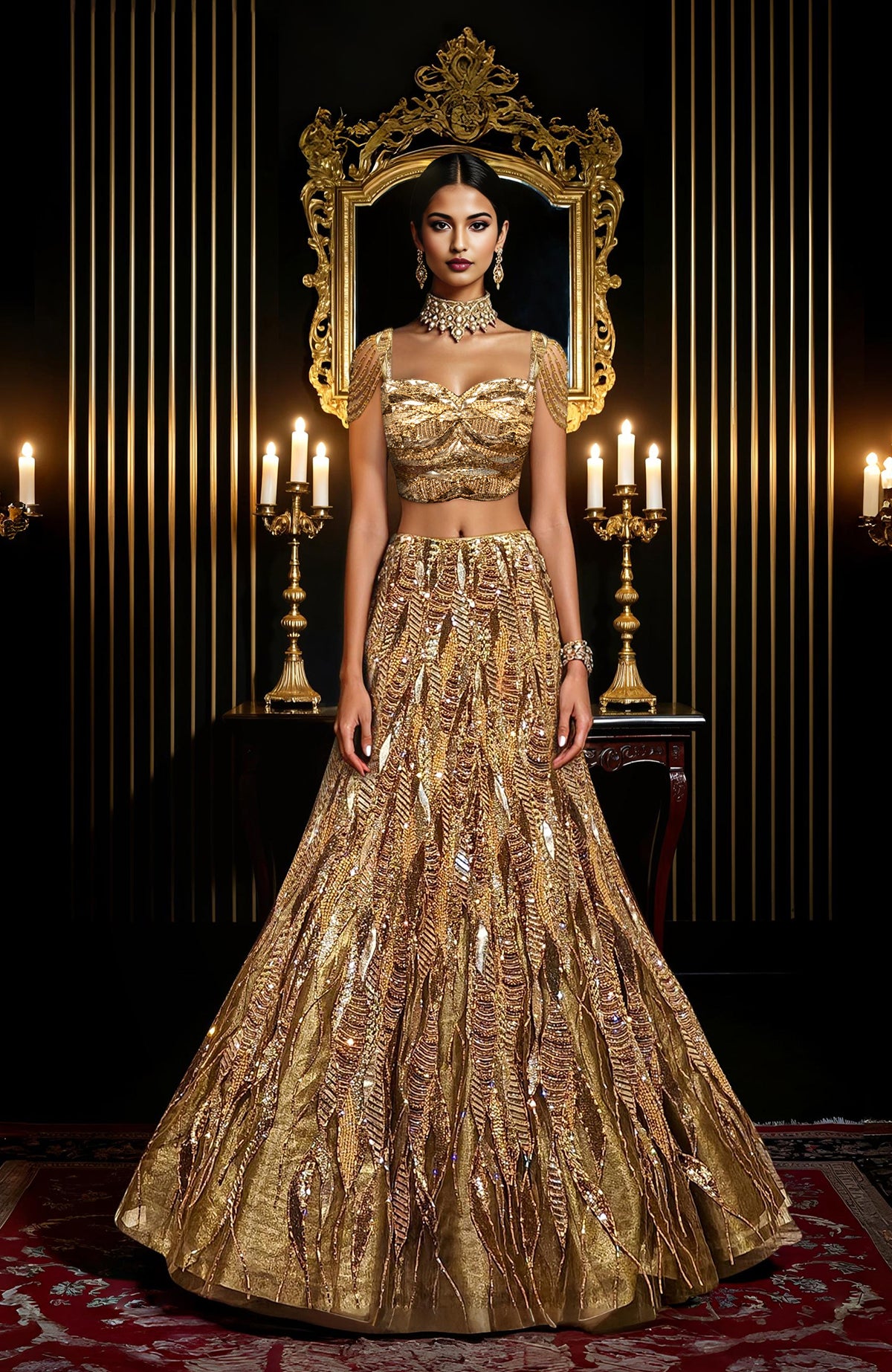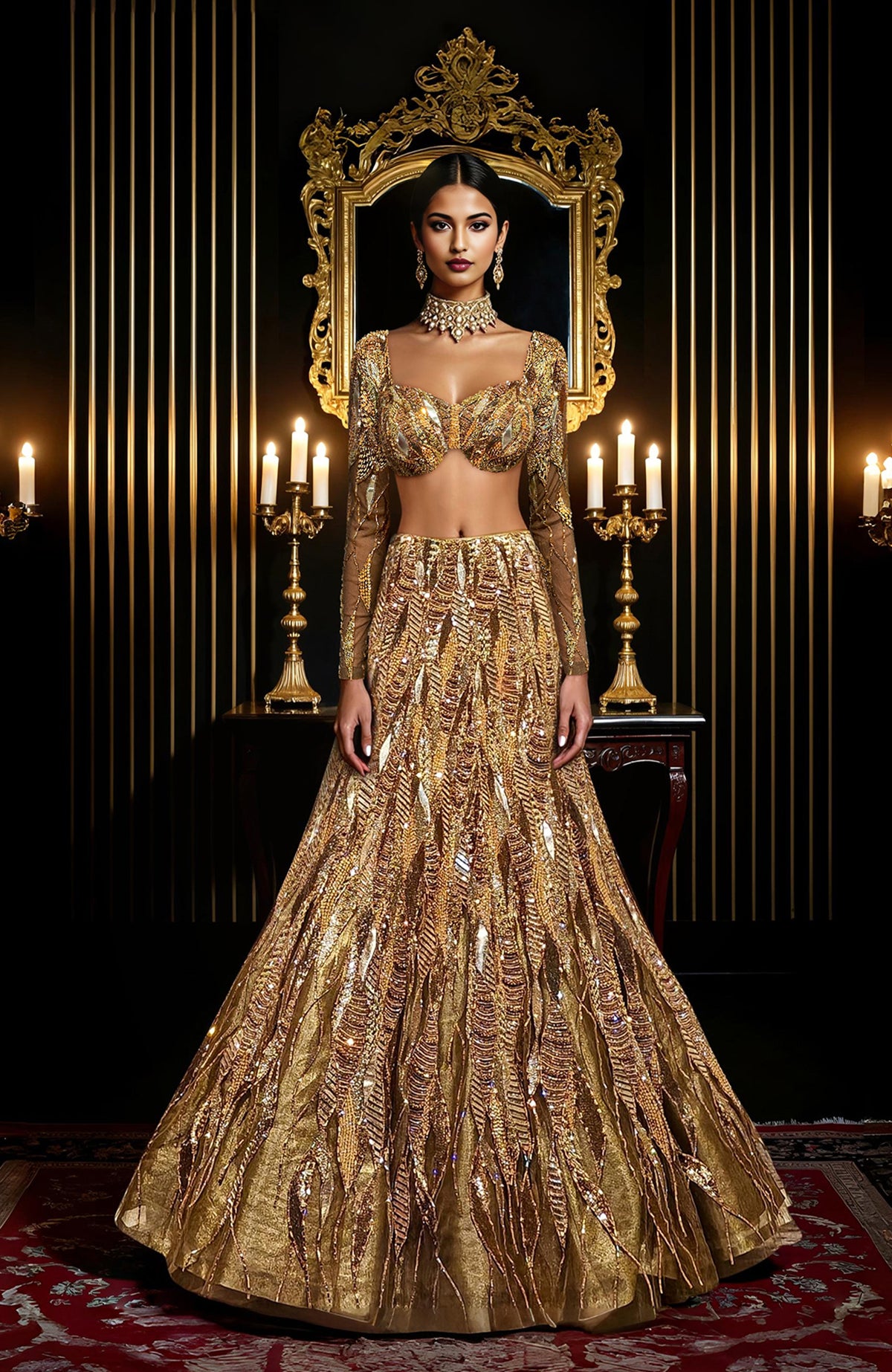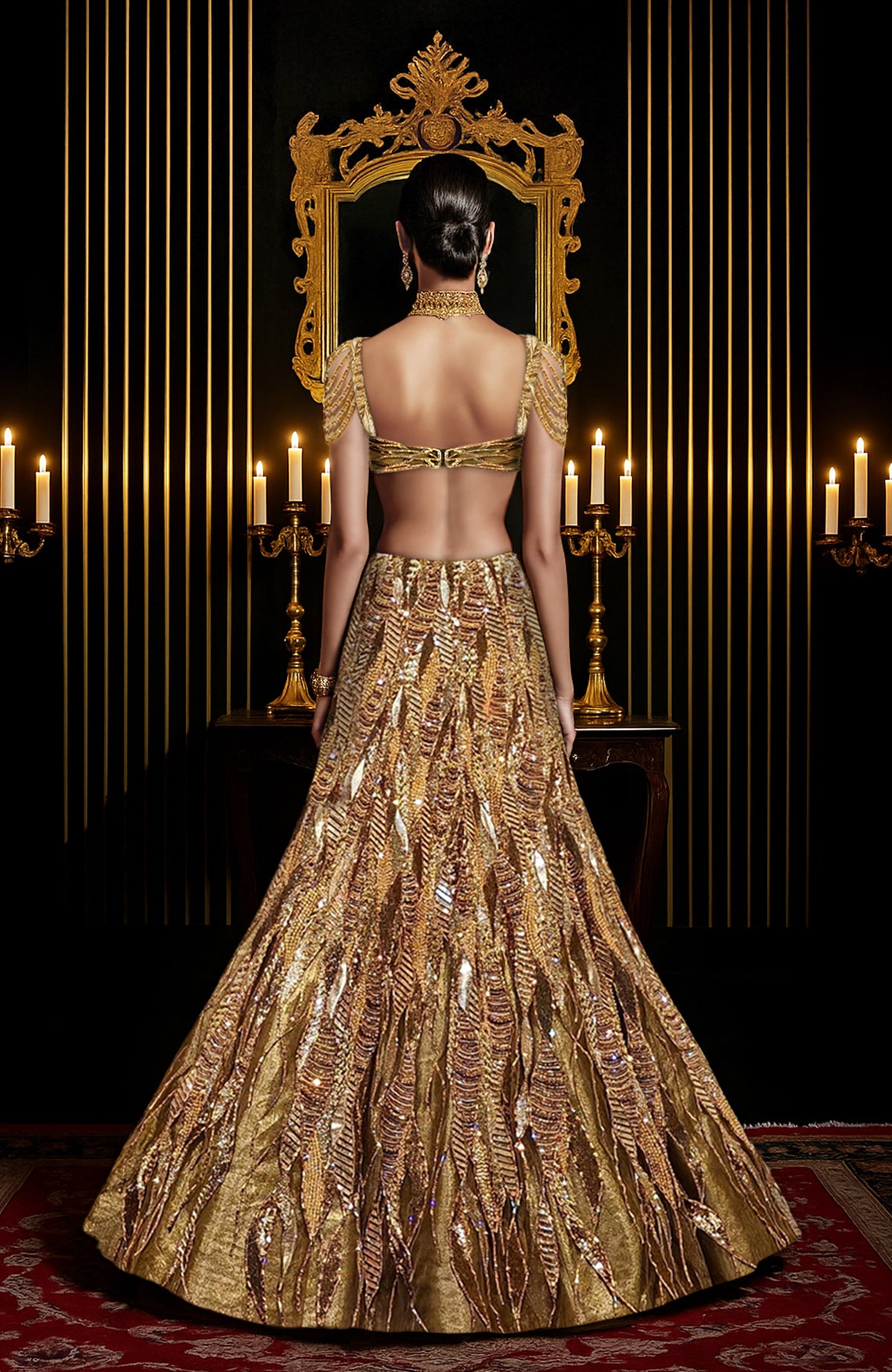 The structured bralette blouse—crafted in shimmering gold sequins and delicately draped shoulder chains—evokes strength and sensuality. Its sweetheart neckline and sculpted fit accentuate the power of form, while the flowing lehenga skirt glistens with tonal embroidery in a cascading feather-leaf motif. Each panel is embroidered in hand-sewn sequins, cutdana, glass beads and crystals that ripple and reflect light like a poetic memory—glowing in golds and amber like a slow-burning flame. A statement shoulder cape in tulle with shimmer beading completes the look.