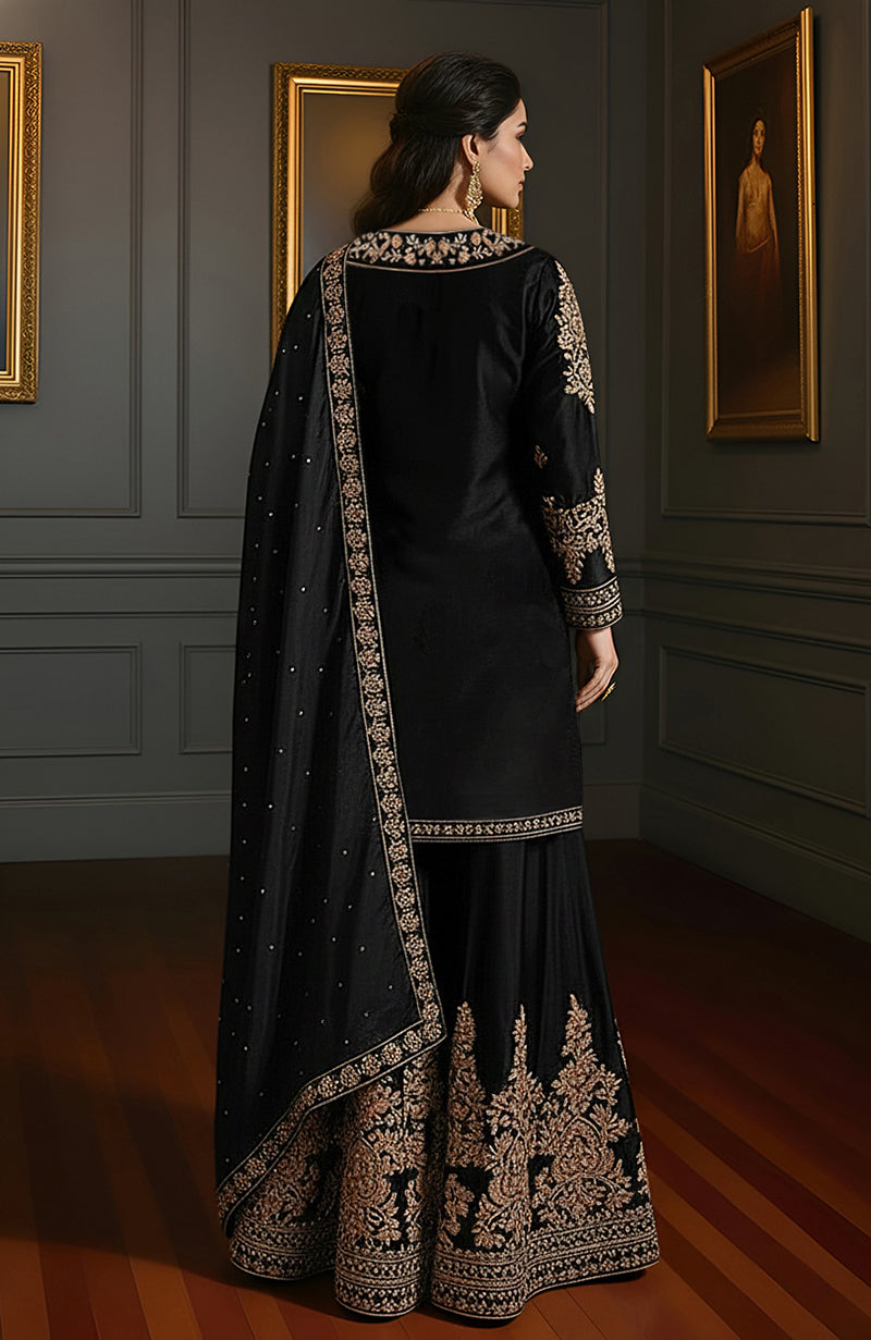 A stunning Black sharara set with intricate gold embroidery, exuding regal elegance. The ensemble consists of a kameez (tunic), wide-legged sharara pants, and a sheer dupatta, all adorned with exquisite detailing.  A perfect choice for formal occasions and weddings.