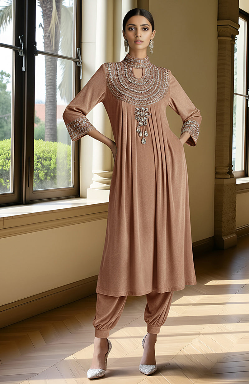 This ensemble is a refined outfit featuring a pleated, flowing tunic paired with draped harem-style pants. The tunic is crafted from a soft, fluid fabric in a muted Rose Tan hue, exuding an understated yet regal elegance. The silhouette is relaxed, with gentle pleats cascading from the heavily embellished bodice, adding graceful movement to the design.