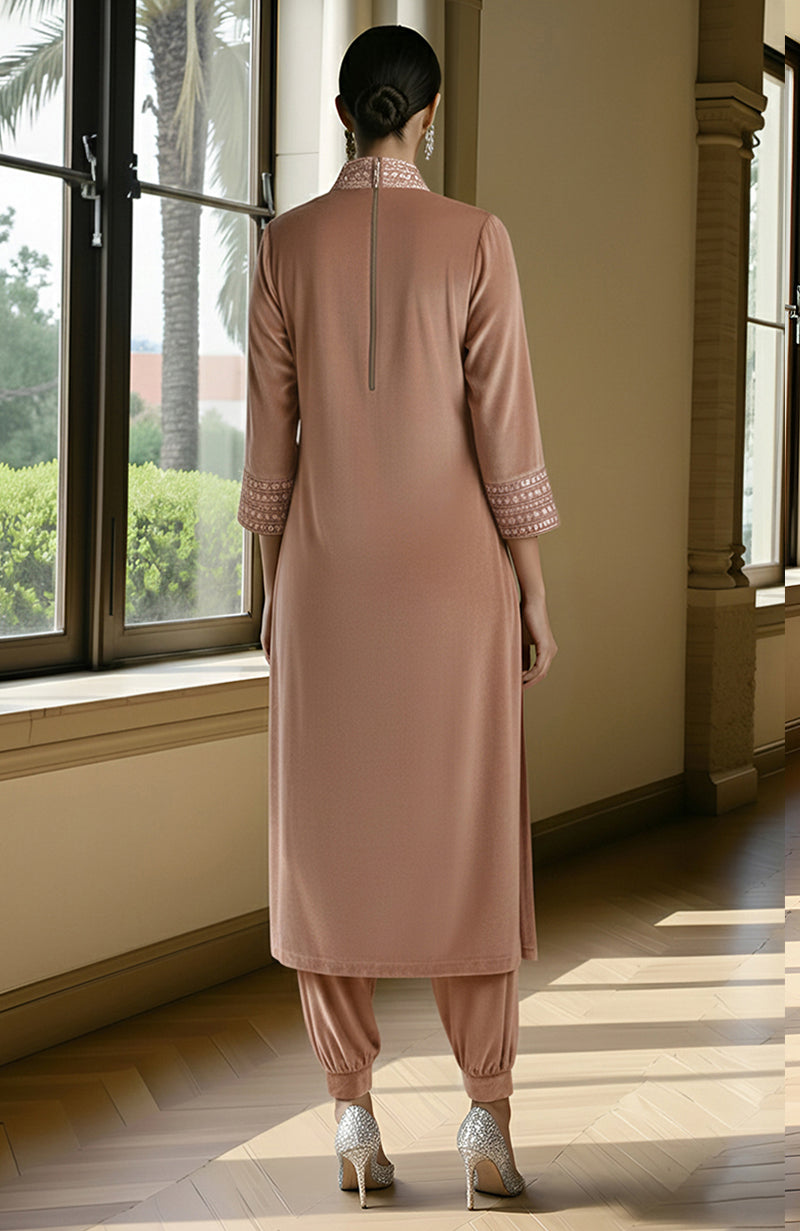 Rose Tan Bead and Crystal Embroidered Velvet Kurta set