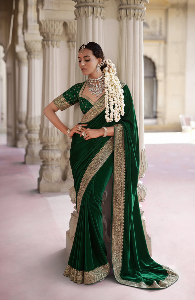 This is a traditional Indian bridal saree in a rich, emerald green hue, exuding elegance and cultural heritage. The saree features an opulent gold dabka embroidery that runs along the borders in intricate floral and paisley patterns. The blouse is heavily embellished with detailed embroidery work on the sleeves and neckline, incorporating sequins and stones that add shimmer and luxury. Complementing the saree is a sheer net dupatta or veil in the same magenta shade, delicately adorned with scattered sequins and finished with an embroidered dabka lace trim, enhancing the bridal aura. Draped in the classic Nivi style, the saree fits gracefully, blending tradition with regal sophistication. Though the label or brand is not visible, the ensemble clearly reflects high-quality craftsmanship and a luxurious design meant for ceremonial or bridal occasions.