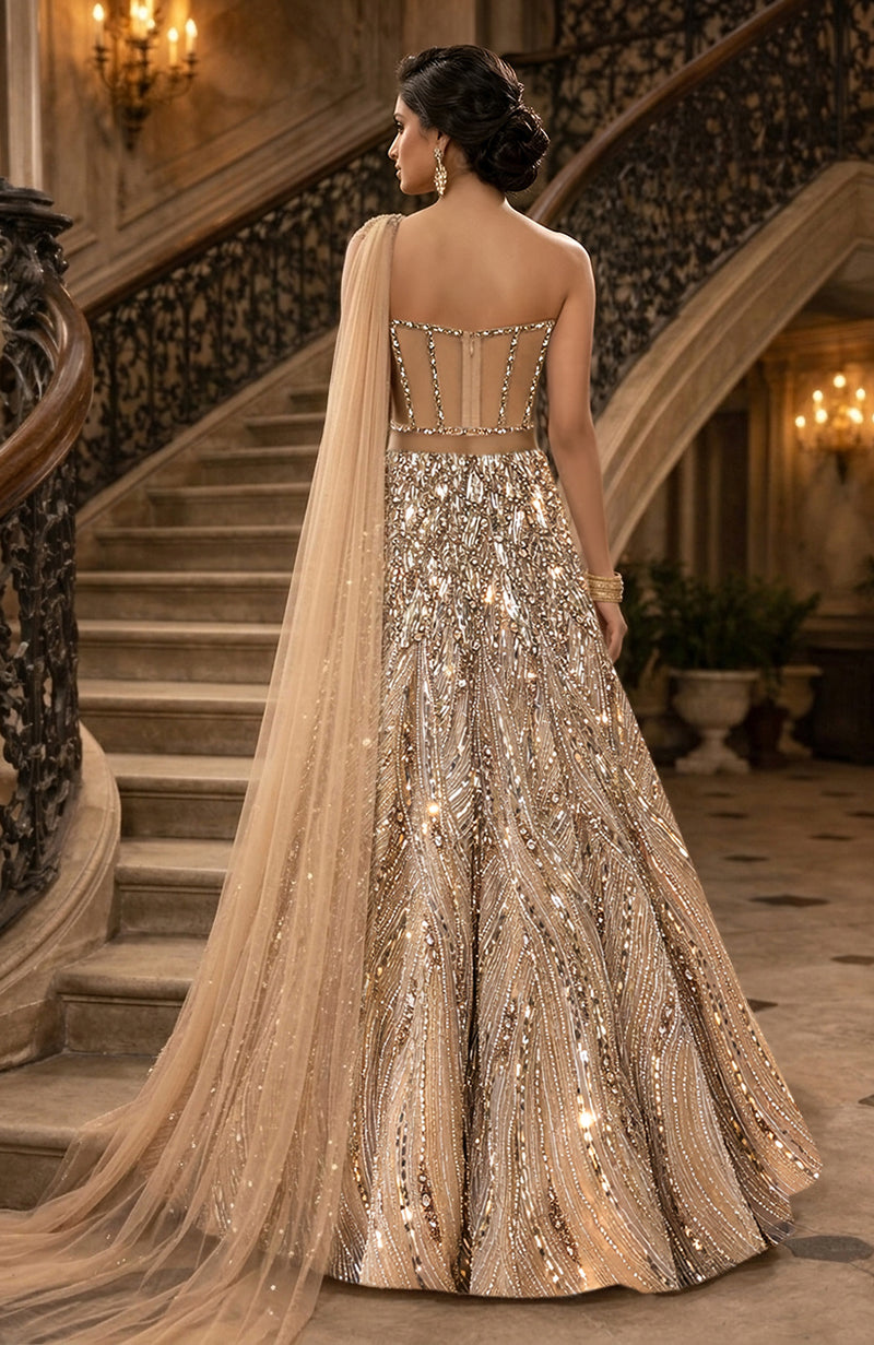 The Laila Champagne Gold Crystal Corset Lehenga with One-Shoulder Drape is a luxury bridal couture masterpiece designed for grand receptions and high-glam wedding celebrations. Crafted in a rich champagne gold net base, this designer lehenga features a structured crystal-embellished corset bodice with illusion detailing that sculpts and enhances the waistline.