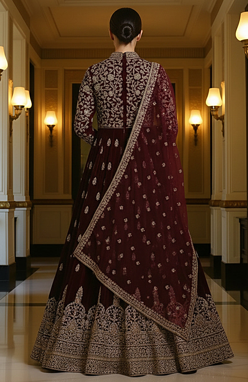 Ideal for brides searching for velvet Anarkali, zardozi Anarkali, maroon winter wedding outfit, or heritage embroidered Indian couture.