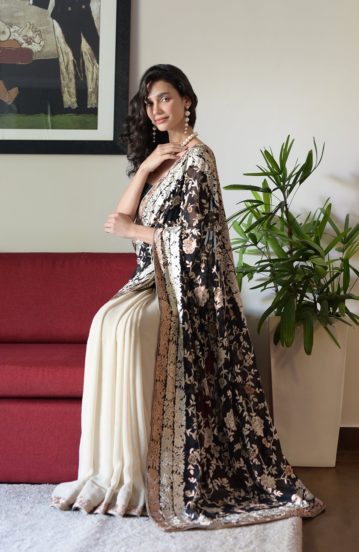 Black-Beige Masterpiece Parsi Gara Hand Embroidered Saree