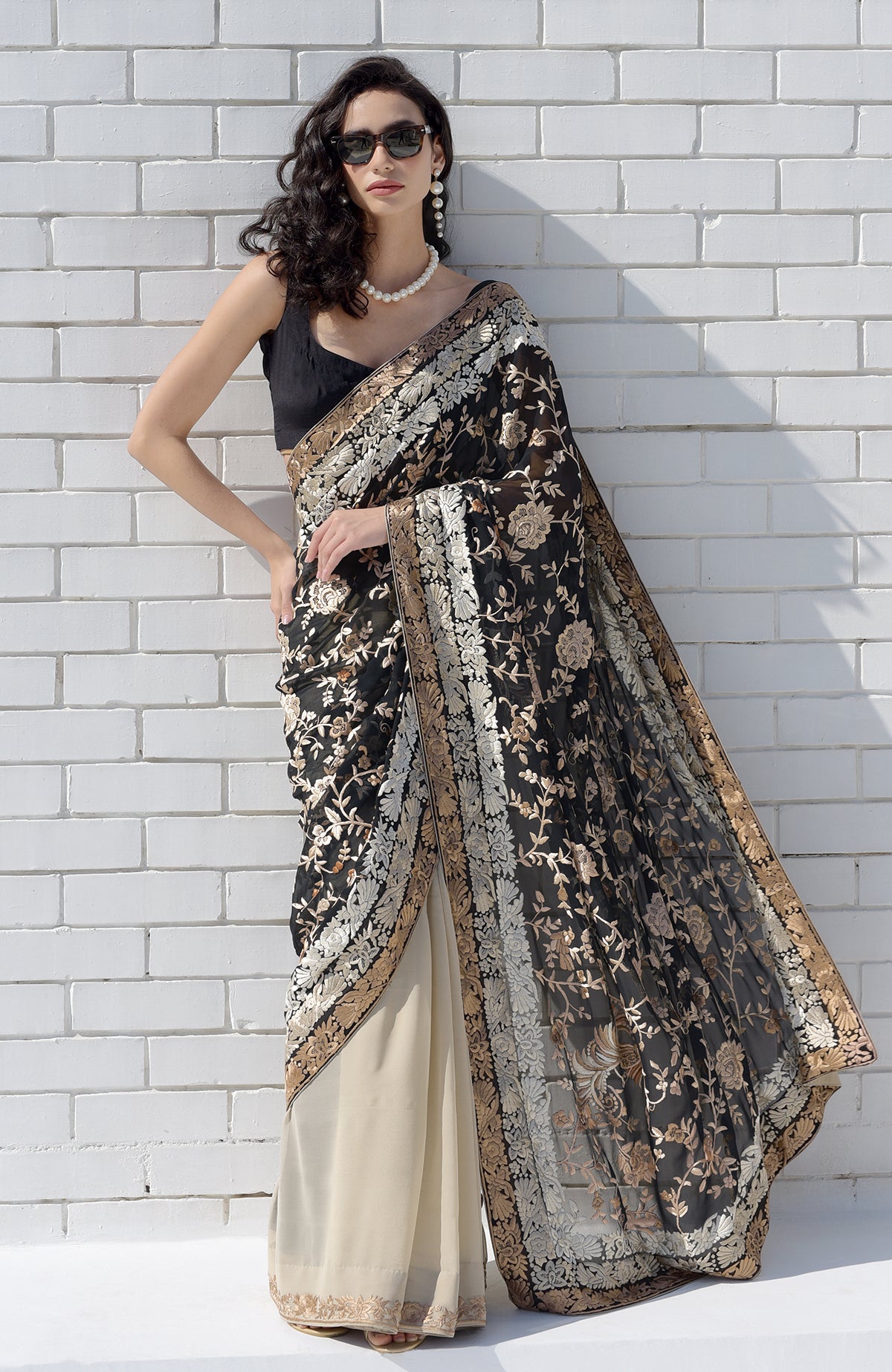 The Black-Beige Parsi Gara is a hand-embroidered masterpiece displaying the most exquisite craftsmanship of heritage Gara embroidery. This saree features an all-over embroidered pallav and border embroidery on the contrasting beige body of the saree. With a stunning three-tier border, intricate birds and floral Persian motifs, and an ethereal combination of pearl, cream, and beige this saree is a heritage connoisseur's delight. The saree comes with a hand-embroidered blouse piece with a Parsi Gara embroidered border on the sleeve ends.