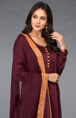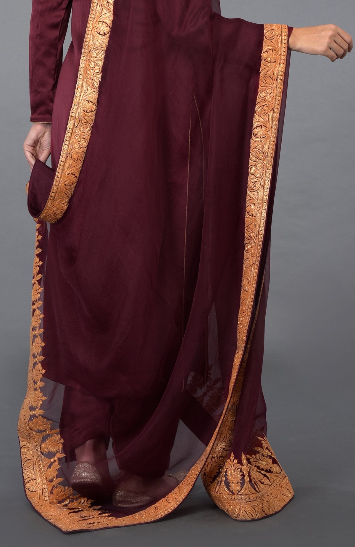 Burgundy salwar pants suit paired with Kashmiri Gold Tilla embroidered dupatta.