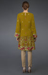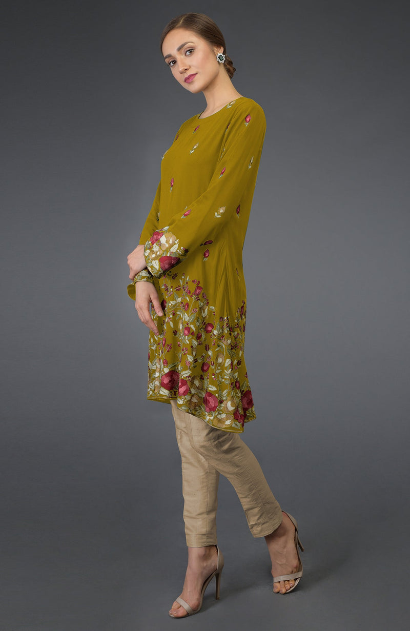 From our limited edition capsule of Parsi embroidered tunics, this is a mustard georgette tunic adorned with parsi floral embroidery in shades of mustard, maroon, wine, brown, beige and green. The top has a jewel shaped neckline and 3.5 inches long back neck keyhole opening with button closure. The front neck depth is 5.5 inches and back neck depth is 4 inches. The sleeves are bell shaped.
