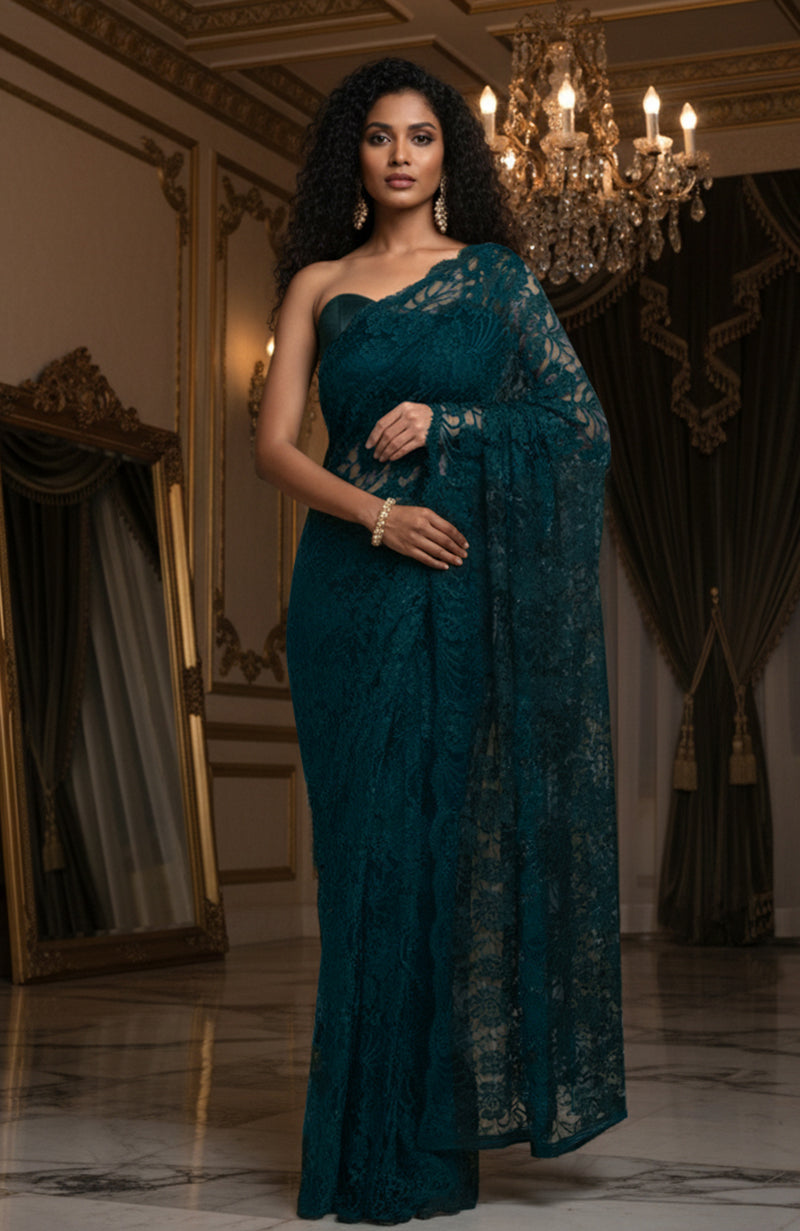 The saree is made from authentic French Chantilly lace, celebrated for its feather-light drape, intricate floral tracery, and hypnotic textural depth. The rich teal shade enhances every pattern, creating a luxe shadow-play effect that feels both regal and seductively modern.